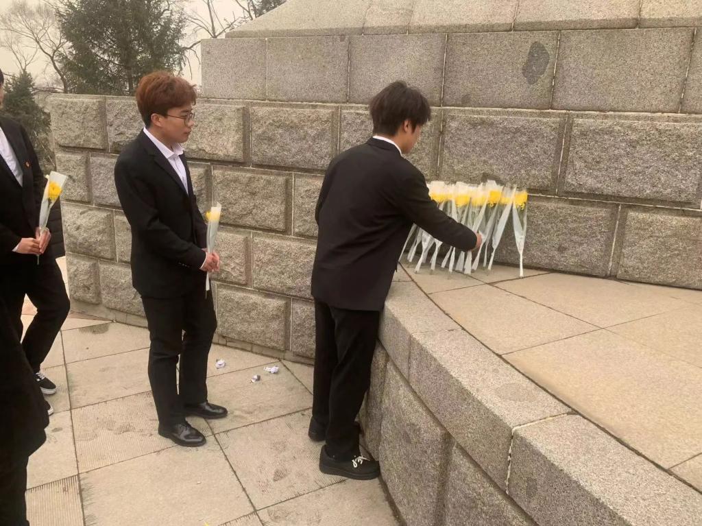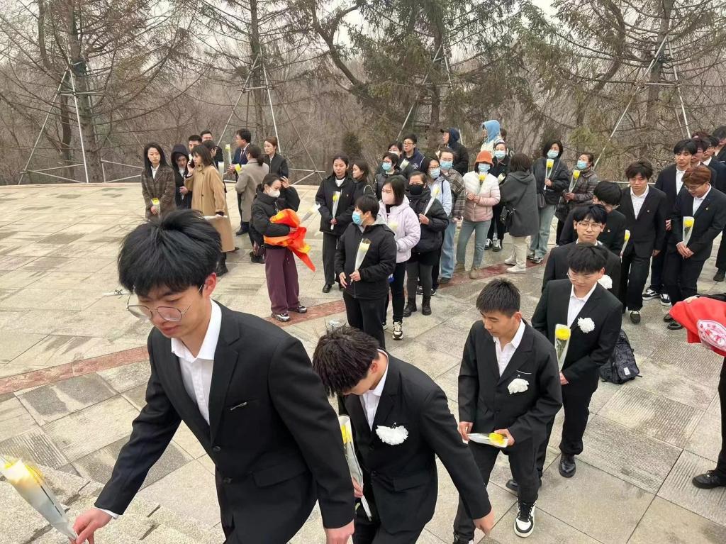 祭扫仪式上,同学们手捧鲜花,整齐肃立在烈士陵园的广场上,面对纪念碑低头默哀,向为国家和人民解放事业献身的英烈们致以崇高敬意和无限哀思。