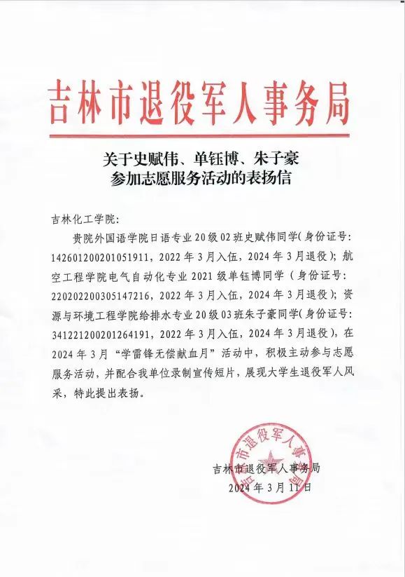 “单钰博同学在2024年3月‘学雷锋无偿献血月’活动中,积极主动参与志愿服务活动,并配合我单位录制宣传短片,展现大学生退役军人风采,特此提出表扬”