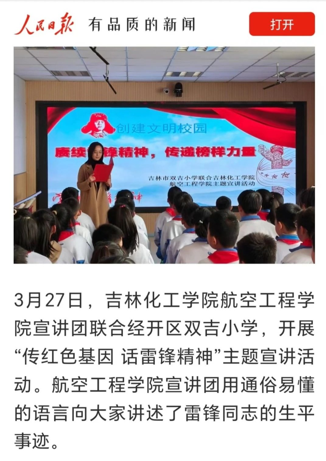 近日,航空工程学院为进一步推进大中小学思政课一体化建设,切实发挥思政课立德树人关键课程作用,全面增强思政育人效果,与吉林市双吉中学、经开区双吉小学开展主题宣讲、社会实践、教学观摩等结对共建系列活动,此次活动报道被人民日报转载!