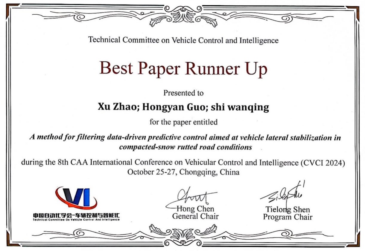 近日,我院赵旭老师在10月25日至27日于中国重庆召开的第八届CAA国际车辆控制与智能化会议(The 8th CAA International Conference on Vehicular Control and Intelligence,CVCI2024)上,凭借其研究成果荣获最佳论文奖项的Best Paper Runner-UP Award。本次会议汇集了来自10多个国家的379篇论文,是CVCI会议有史以来规模最大、参会人数最多的一届。经过严格的学术评审和答辩,最终有2篇论文荣获最佳论文奖,2篇论文获得郭孔辉青年论文奖。