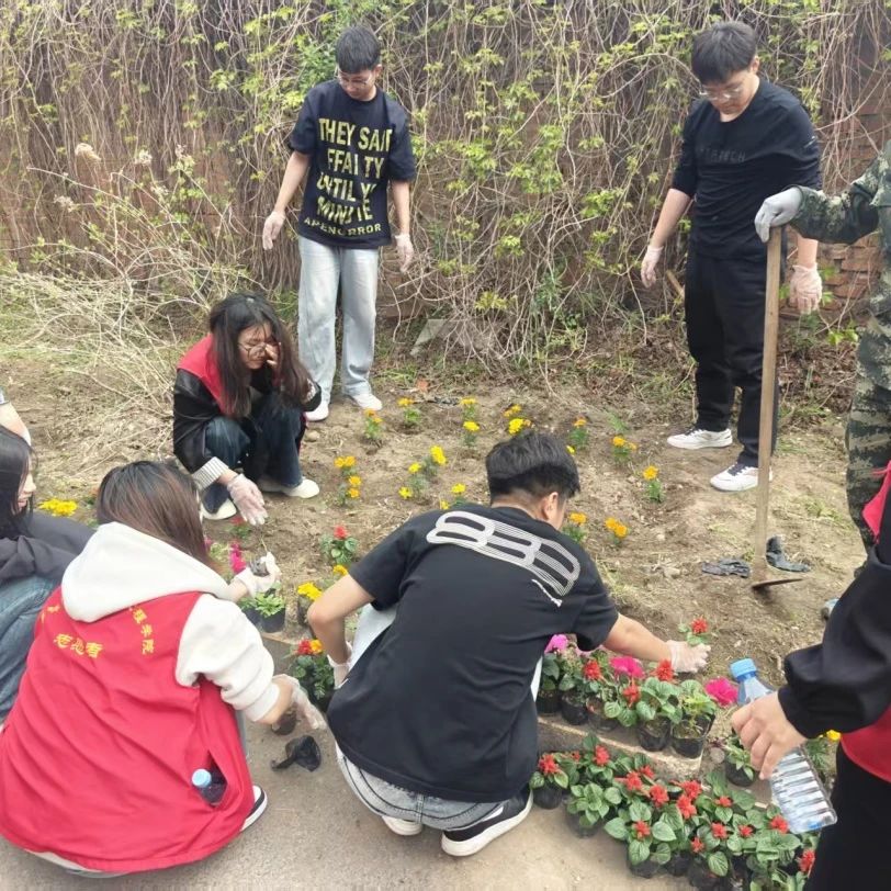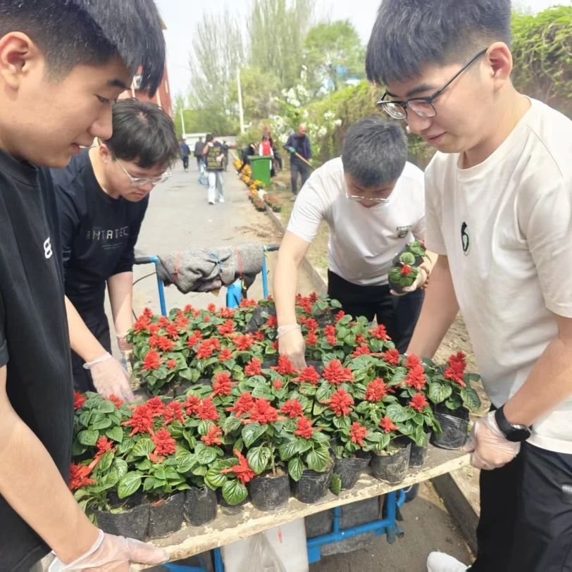 活动伊始,党员志愿者们积极响应号召,投身于活动中。活动现场,志愿者们分工明确,各司其职。搬运组由柴梓轶、王麒等成员组成,他们轻拿轻放,确保花苗安全“抵达”至指定区域;清理组的刘珈旭、侯毅等成员一丝不苟地清理花坛杂物、翻新土壤,为花苗生长营造良好环境;栽种组的徐赫、李博识等成员则专注于挖坑、植苗与培土,每个环节都严谨规范。大家分工明确、配合默契,现场气氛热烈而有序。